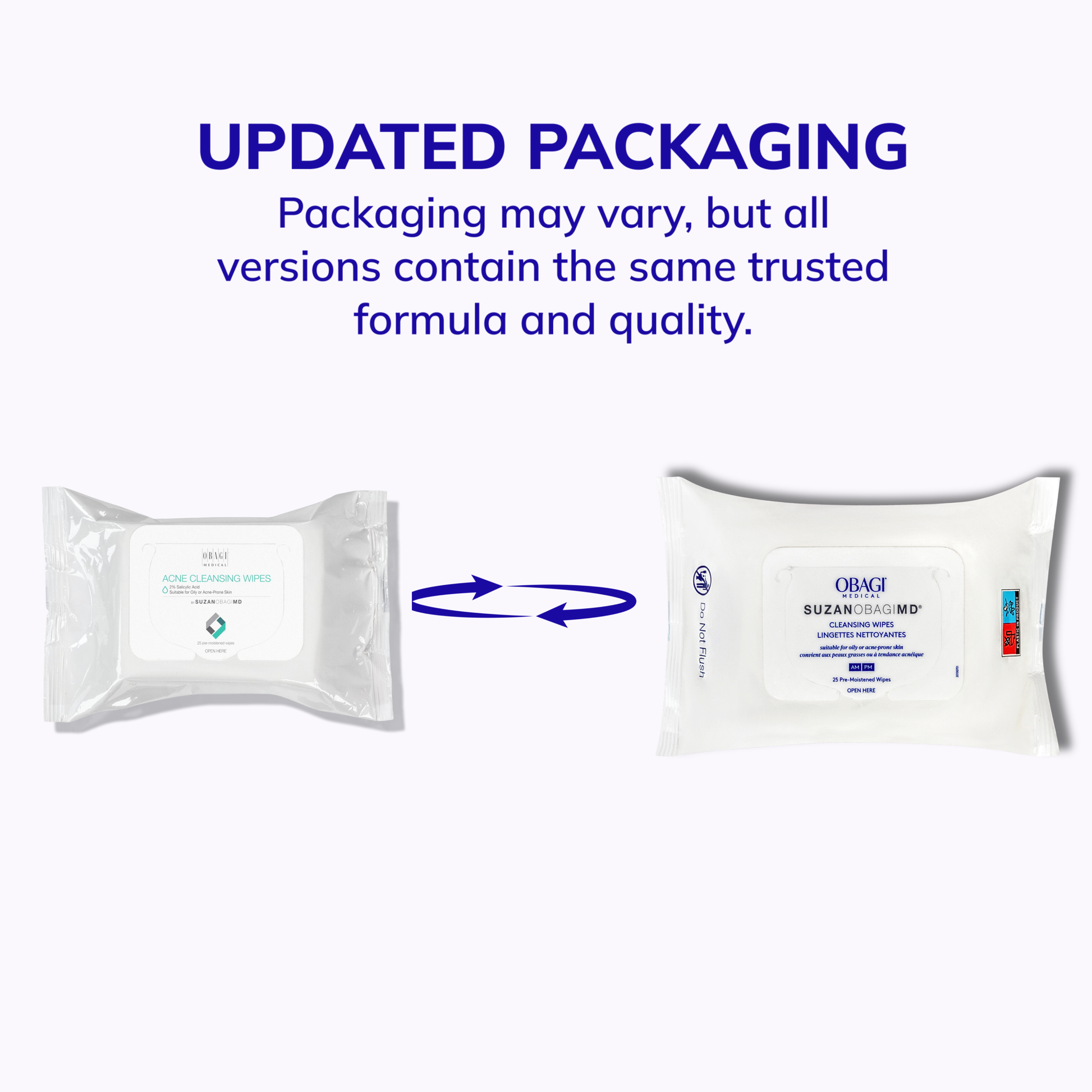 Formerly known as Obagi SUZANOBAGIMD On the Go Cleansing Wipes for Oily or Acne Prone Skin (25 count) The Obagi SUZANOBAGIMD Acne Cleansing Wipes are pre-moistened, dermatologist-developed wipes designed to quickly and effectively clear away excess oil, impurities, and pore-clogging debris. Formulated with gentle yet powerful acne-fighting ingredients, these wipes help reduce breakouts, minimize shine, and refine the appearance of pores, without stripping or irritating the skin. Perfect for on-the-go use, post-workout cleansing, or as a quick refresh throughout the day, they leave the skin feeling clean, balanced, and soothed while supporting a clearer, healthier-looking complexion.
